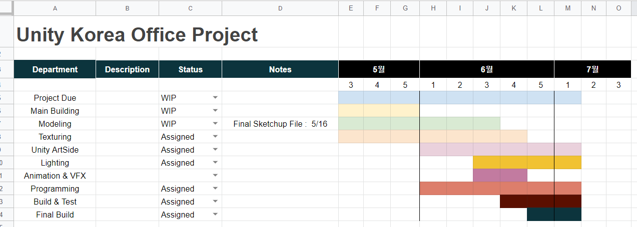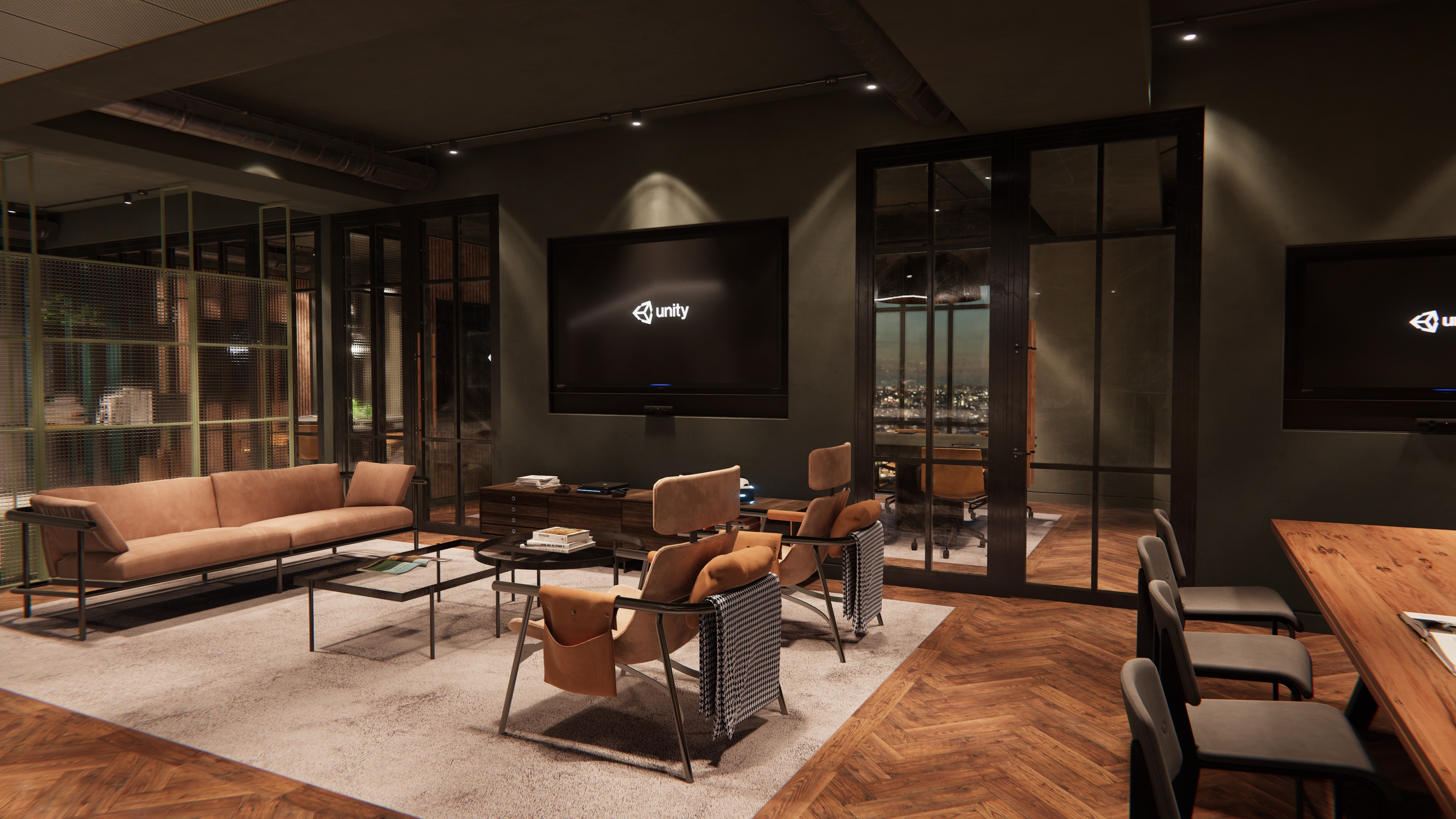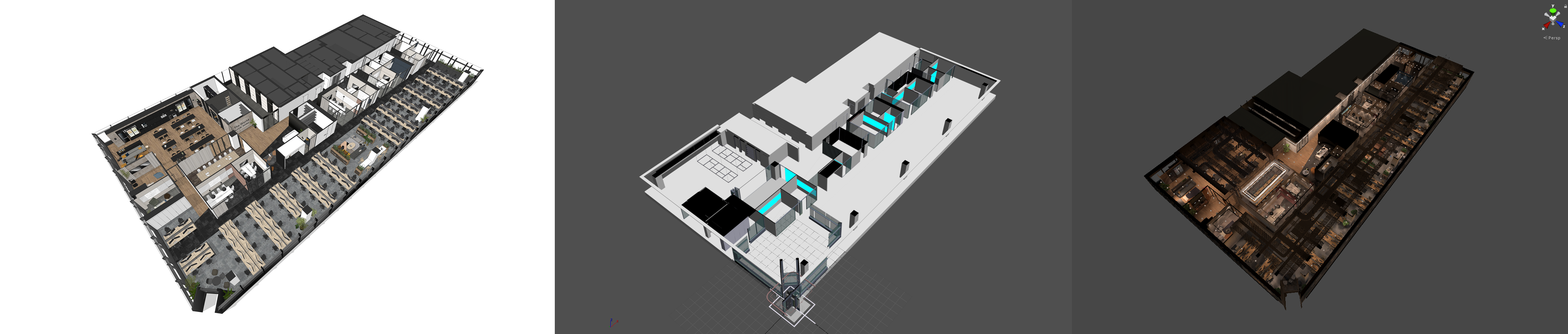유니티 코리아 오피스 프로젝트에 앞서 Onerios라는 회사에서 Unity London Office 프로젝트를 진행 하였다. (Mike Geig의 London Office Scrollthrough )그래서 이 프로젝트를 기반으로 로컬에서 보다 빠르게 프로젝트를 진행할 수 있었다. 유니티 오피스는 글로벌적으로 같은 브랜딩을 가지고 있다. 같은 책상, 같은 의자 심지어 같은 TV 등 그래서 런던 오피스에서 사용한 Asset들을 코리아 오피스에도 무리 없이 같이 사용할 수 있어 시간을 많이 단축할 수 있었다. 한국 오피스에만 있는 특별한 어셋들의 모델링은 3ds Max로 메테리얼 작업은 Substance를 사용하였다. 혹시 유니티로 비슷한 프로젝트를 계획하고 있다면, 유니티의 에셋스토어에도 많은 3D에셋(메테리얼 포함)들이 있으니 사용해 보길 권장한다.