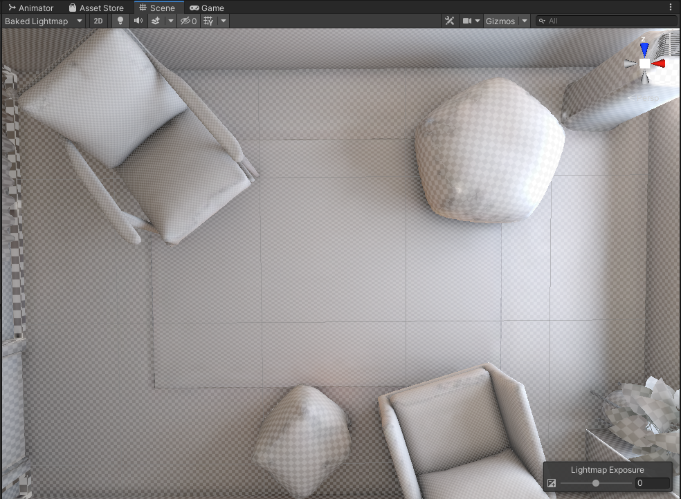 상단의 Baked Lightmap을 켜서 보면 Lightmap 어떻게 구워졌는지 확인할 수 있습니다. 그리고 Scene 모드를 Baked Lightmap으로 하면 Scene에서 환경광이 어떻게 구워졌는지 볼 수 있습니다.