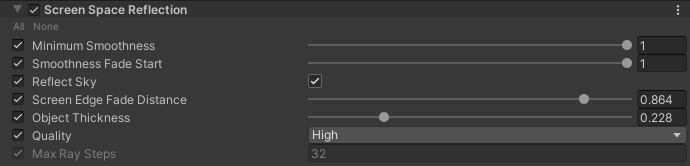 설정해 주고 환경 세팅에 가 보면 이제 Screen Spaced Reflection을 사용할 수 있을 것입니다. 실시간 반사효과기 때문에 퍼포먼스를 좀 낮추니 유의하시면 좋을 것 같아요.