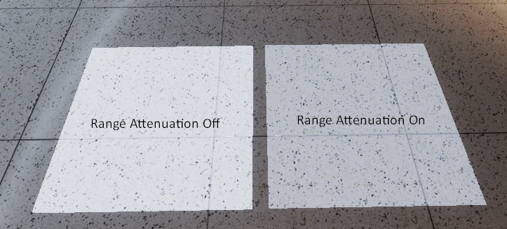이 HDRP 버전은 Box 모양 Spotlights에 Range Attenuation이 추가되어 전체 범위에 걸쳐 조명이 균일하게 빛납니다.