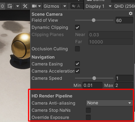 안티앨리어싱 모드 및 stop NaN과 같은 HDRP 전용 Scene view Camera 속성은 더 이상 기본 설정 창에 없고 대신 Scene view Camera 설정 메뉴에 있습니다.