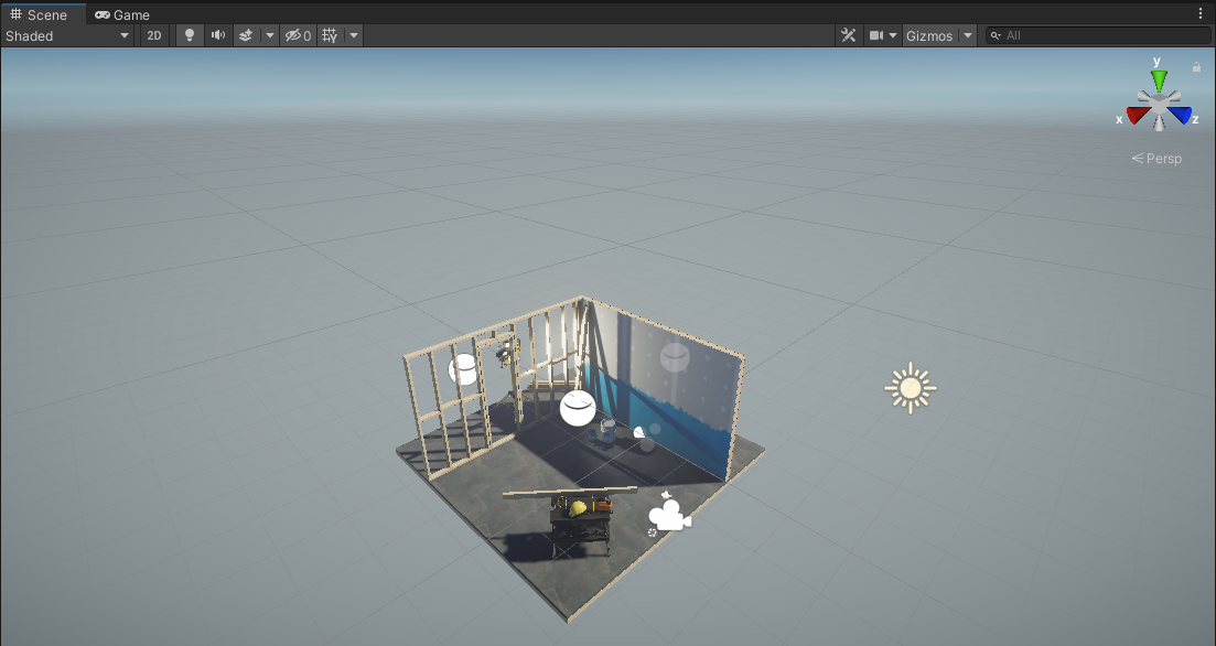 에디터의 가운데에 큰 자리를 차지하고 있는 Scene 창을 쉽게 찾으실 수 있습니다. 라이브 프리뷰 창이라고 생각하시면 편할 것 같은데요. 씬에서 오브젝트를 배치하거나 이동 할 수 있습니다. Shaded 를 눌러보시면 오브젝트를 여러 View로 확인 할 수 있습니다. 그리고 옆에 2D 버튼을 눌러보면 Scene을 2D 모드로 볼 수 있습니다. 다시 한번 누르면 원래의 3D 모드로 볼 수 있습니다. 그리고 전구모양의 버튼은 전체 씬의 Lighting을 껏다 켯다 할 수 있습니다. 오디오모양의 버튼은 음향을 껏다 켯다 할 수 있습니다. 그리고 다음 드랍다운 버튼은 Skybox, 안개, 포스트프로세싱, 이펙트 등을 한번에 껏다 켯다 할 수 있고 드랍다운 메뉴이기 때문에 개별로도 컨트롤 할 수 있습니다. 외에도 Y 그리드로 표시된 아이콘은, Grid를 컨트롤 할 수 있습니다. 드랍다운 메뉴로 축을 바꿔 보실 수도 있습니다. Gizmos 버튼으로는 Scene에 표시된 Gizmo들을 사이즈 / 표시를 제어할 수 있습니다. Scene의 우측 상단에 XYZ 축이 있는데요. Unity는 Y축이 위를 향하고 있습니다. 축별로 View를 바꿔서 볼 수 있고 바로 아래 써져있는 Persp 를 확인 하실 수 있는데요. 지금 현재는 원근감이 있는 Perspective View이고 이 글자를 한번 클릭하면 원근감이 없는 Isometric View로 전환 할 수 있습니다. Scene View에 있는 오브젝트를 클릭(좌) 하면 옆에 있는 Hiearchy(계층)창에 강조 표시 됩니다.