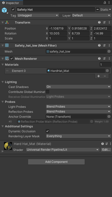 계층창에서 오브젝트를 선택 할 때마다 Inspector 창이 객체 별로 각기 다른 정보를 보여줍니다. Example Asset > Prop > Workbench> Safety Hat을 예를 들어보면 객체의 이름과 함께 아래 Transform, Mesh, Mesh Renderer, Material 컴포넌트를 확인 할 수 있습니다. Transform은 이 객체가 Scene에서 어디에 위치하고 있는지 크기는 얼마인지 표시해 주고 있습니다. 필드의 수치값을 바꾸면 실시간으로 객체의 위치/크기 값이 바뀌는걸 확인 할 수 있습니다. 그리고 아래에는 이 객체가 어떤 모양을 가지고 있고, 어떤 메테리얼을 사용하고 있는지 표시합니다. 유니티는 Component 추가하는 형식으로 하나의 오브젝트를 구성할 수 있습니다. 이를 Object-Component 모델이라 합니다. 인스펙터 창 맨 아래 Add Component라는 버튼을 눌러보면 다양한 다른 Component를 추가 함으로써 이 객체에 정보를 더 많이 부여할 수 있습니다. 이 컴포넌트는 물리 시스템 정보를 가질 수도있고, Lights를 넣으면 조명 정보가, Camera를 넣으면 오브젝트가 Camera가 되어 Scene을 들여다 보고, 또 Script를 추가하면 오브젝트에 더 많은 입력 값을 줄 수도 있죠. 마치 레고처럼 여러 컴포넌트를 추가해 하나의 오브젝트를 구성 할 수 있습니다. 모든 오브젝트가 한가지 공통적으로 가지고 있는 Component는 Transform 입니다. 다른 컴포넌트들은 선택 사항으로 필요시 추가 할 수 있지만, Transform은 오브젝트의 위치/회전/크기 정보값이기 때문에 항상 Default로 들어 가 있습니다. 정리하자면, Inspector 창은 Scene에서 선택한 객체에 따라 내용이 항상 변경이되고, 객체의 속성을 보고 변경 또는 추가할 수 있도록 합니다.