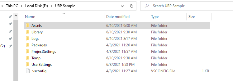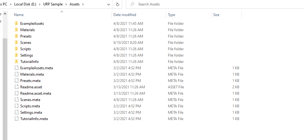 Asset 폴더를 눌러서 볼게요. 프로젝트 창에서는 보이지 않지만, 여기 폴더에는 Meta 파일도 있는데요. 유니티를 사용한지 얼마 안되신 분들은, 에셋 관리를 좀 편하게 하기 위해서 모든 Asset들은 프로젝트 창에서 하시는게 편하실 수 있습니다. 그러면 Meta File도 좀 더 손쉽게 관리 할 수 있습니다.