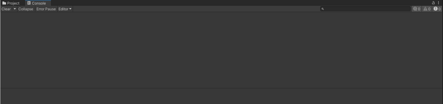 콘솔 창은 게임에서 발생하는 경고와 오류를 표시하며 문제 해결에 도움이 되는 정보를 제공합니다. 기본적으로 콘솔 창 탭은 프로젝트 창 탭의 옆에 위치합니다. Debug는 흰색, 경고는 주황색, 오류는 빨간색등으로 표시되고 오류가 있을경우 프로젝트가 실행 / 빌드가 안될 수 있습니다.