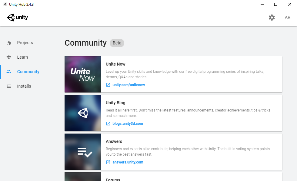 Community 창은 유니티의 여러 소식을 알 수 있는 Tab인데요. Unite Now 나 유니티 블로그 같은 경우는 여러 프로젝트나, 유니티 관련 최신 기술 소식을 볼 수 있는 공간입니다. 그 외에도 유니티로 프로젝트를 진행하다가 궁금한 점이 있을 때 마다 여기에 글을 올리게 되면 세계 각지의 유니티 유저들이 답을 올려주기도 합니다. 한국 같은 경우에는 유니티 코리아에서 Unity Square라는 웹사이트를 따로 운영하고 있어서 이벤트나 리소스, 그리고 여러 사례들을 찾아보실 수 있습니다. 또 페이스북이랑 Naver Hub에 커뮤니티가 형성이 되어 있는데요. 페이스북 같은 경우에는 유니티 페이지도 따로있고 개발 관련된 질문이 있으면 유니티 개발자 페이지에 올리면 여러 한국 개발자들이 친절하게 답변을 달아 주십니다. 외에도 Naver Hub에도 큰 커뮤니티가 형성이 되어있으니 확인해 보시면 좋을 것 같습니다. 유니티 코리아 유튜브 채널에는 다양한 웨비나, 튜토리얼, 한달에 한번 Live 진행에서는 최신 기술 데모 설명/시연 등 다양한 콘텐츠가 있으니, 구독과 좋아요 꾹꾹 눌러주세요. 여러분의 관심과 사랑을 먹고삽니다.